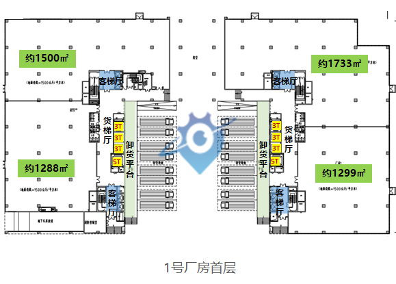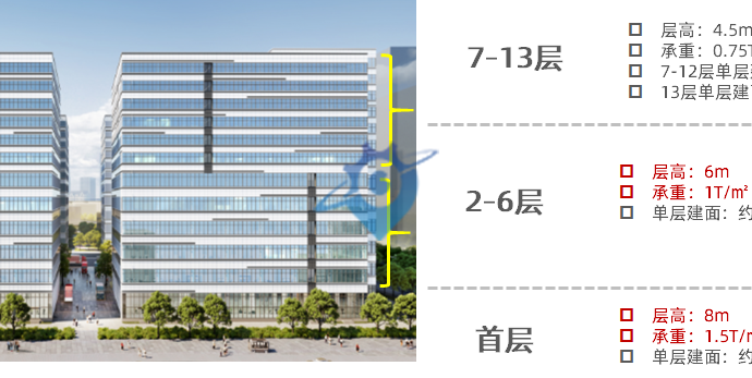 【总占地面积】38549㎡ 【总计容建筑面积】23.9万㎡ 【物业组成】厂房(M1)+配套宿舍+配套商业 【可售物业】厂房(M1) 产品亮点 ?约1300-7100㎡?阔绰空间任意组合 ?首层8米,2-6层6米,7-13层4.5米层高,满足各类企业生产空间需求 ?首层荷载?1500?KG/㎡,2-6层荷载?1000?KG/㎡,7-13层荷载?750?KG/㎡,设备放心布局 ?8.7m*10.5m柱间距,最大可布局产线长度约87米,灵活配置生产线 ?客货梯分流,每层4个客梯厅,近82%超高实用率,奢享高品质空间 ?1.2米高卸货平台,每栋16个大型卸货车位,高峰运输无忧 ?大尺寸5T货梯,叉车可进出,工业轻松上楼 ?项目配备约6万㎡配套宿舍(近1600套)和1200㎡商业,职住平衡,招聘?so?easy!