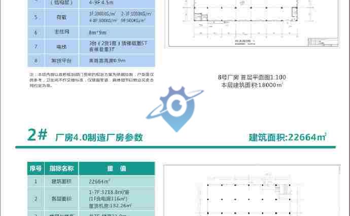【产品参数及户型】 【独栋厂房】 面积1:5350 m2:1000 m2/层,顶层是350 m2; 面积2:6500 m2:1200 m2/层,顶层是500 m2, 楼层:五层半 层高:1F:7.8m、2-6F:4.5 m 承重:1F:2000KG/m2、 2F以上800 KG/m2 电梯:2台:1吨的1台、3吨的1台(桥厢2 m *2.77 m) 独栋的5350 m2是两跨布局,6500 m2是三跨布局 均价:5800/m2 【分层厂房】 面积:2000 m2/层、2166.5m2/层、3218.8m2/层 楼层:7F、8F、9F 层高:1F:7.8m 、2-3F:6m、4F以上:4.5m; 承重:1F:2000KG/m2、2-3F :1000 KG/m2、4F以上800 KG/m2 电梯:3台:1吨的1台、3吨的2台(桥厢2 m *2.77 m) 四跨布局 价格:4200/m2起