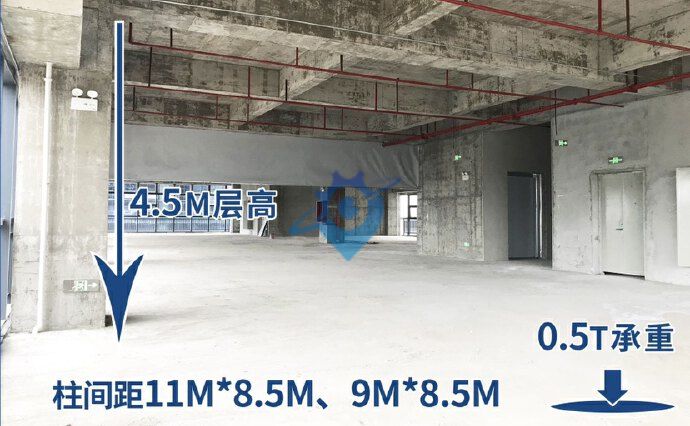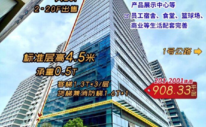 玻璃幕墙现楼即买即用,可作产研办公、轻生产、产品展示中心等。 面积:908.33㎡/层,整层起售 实用率:83% 标准层层高/承重:4.5M/0.5T 电梯:1.3T客梯*3/层,1.6T货梯兼消防梯 柱间距:9m*8.5m、11m*8.5m 停车位:一期车位:925?个(地上?46?个,地下?879?个) 内部道路宽度:外侧环路15-15.5米;中间主道43.5-44米,支路15-20米 配电:70KW/层 交付标准:现状毛坯,大厦首层公区精装